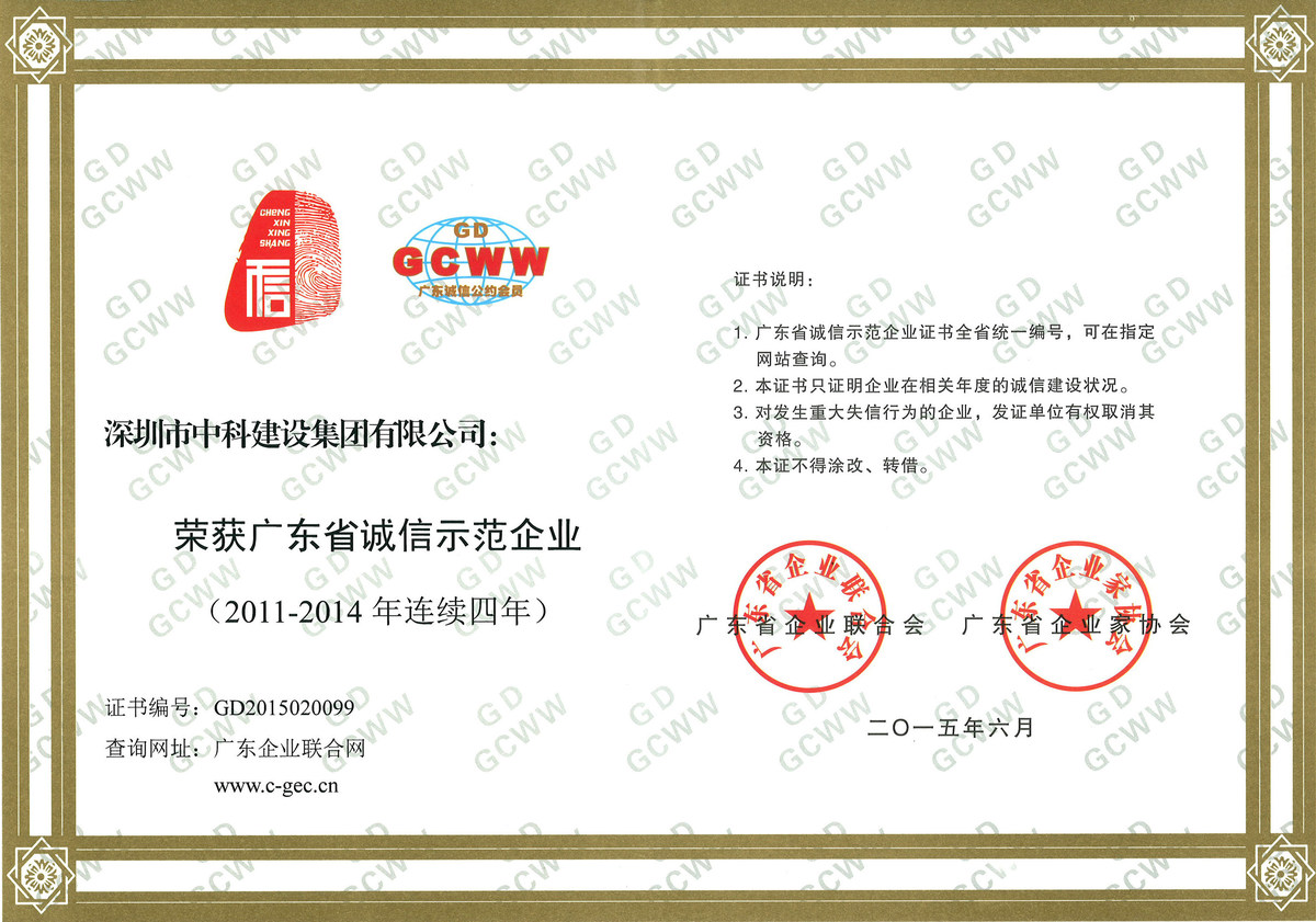 中科建設集團榮獲“2014年度廣東省誠信示范企業”稱號,這是繼2011年以來連續4年榮獲"廣東省誠信...