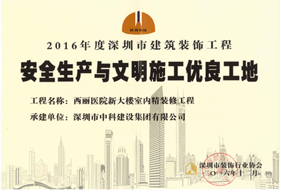 日前,由中科建設(shè)集團(tuán)承建的西麗醫(yī)院新大樓室內(nèi)精裝修工程榮獲“2016年度深圳市建筑裝飾工程安全生產(chǎn)與文明施工優(yōu)良工地”榮譽(yù)稱號(hào)。
