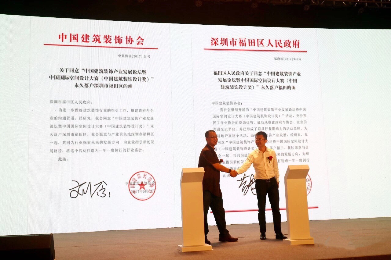 會議還舉行了中國國際空間設計大賽永久落戶福田簽約儀式。中國建筑裝飾協(xié)會副秘書長劉原,中共福田區(qū)委常委、常務副區(qū)長黃偉在現(xiàn)場進行了電子簽約。